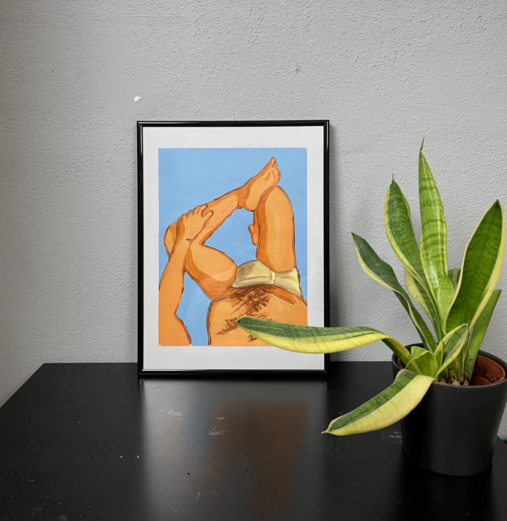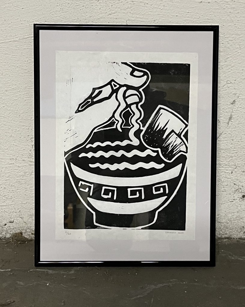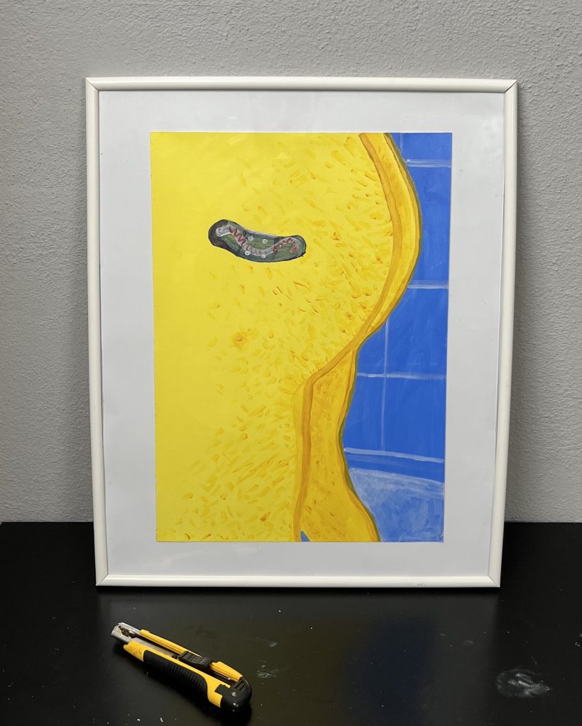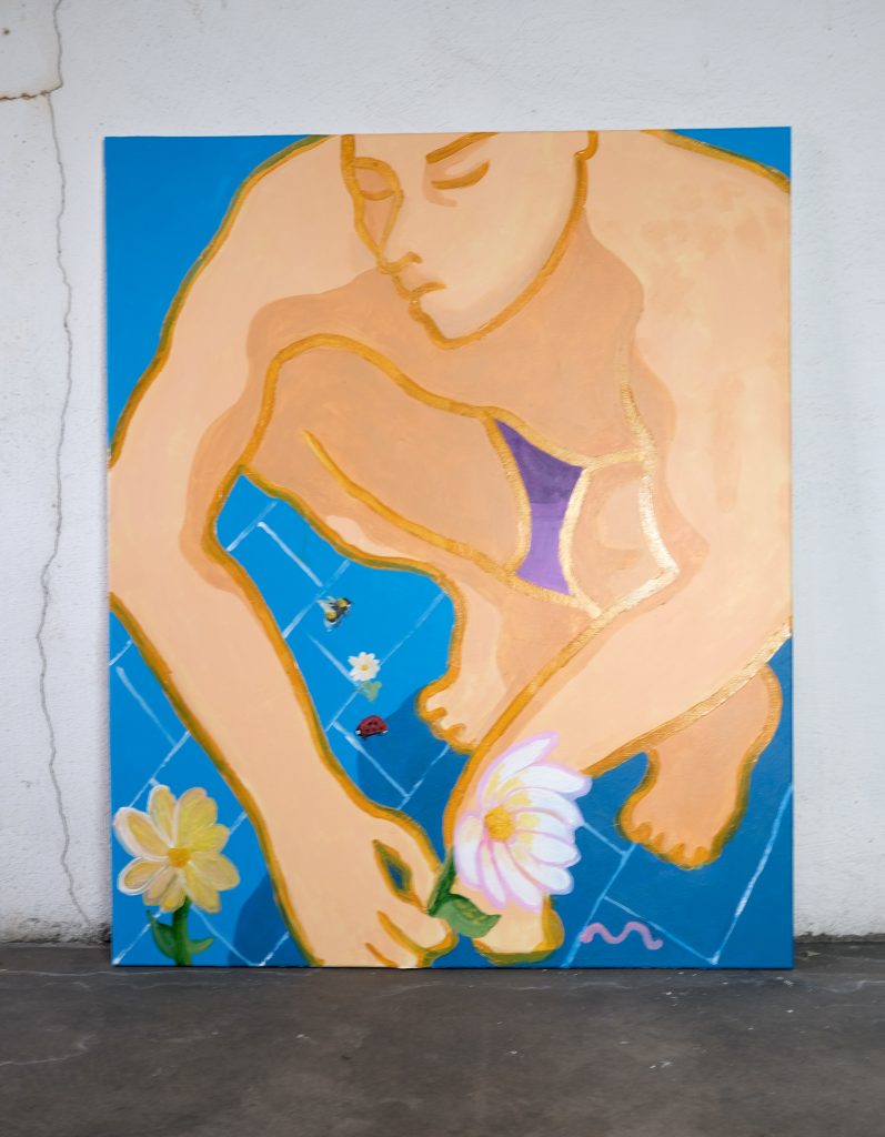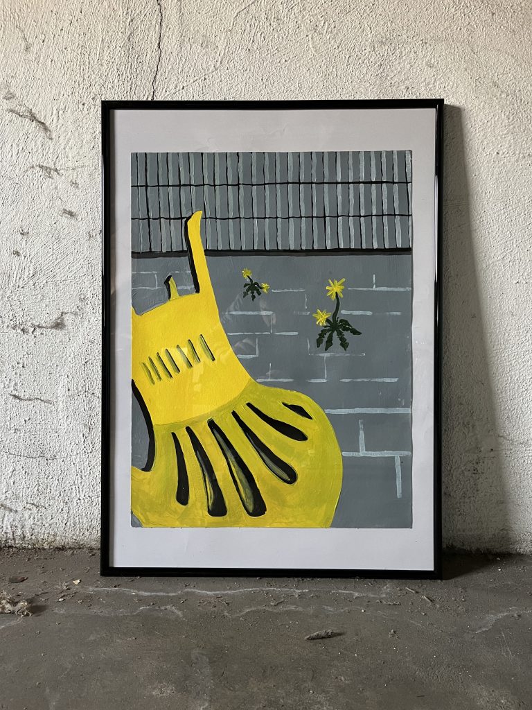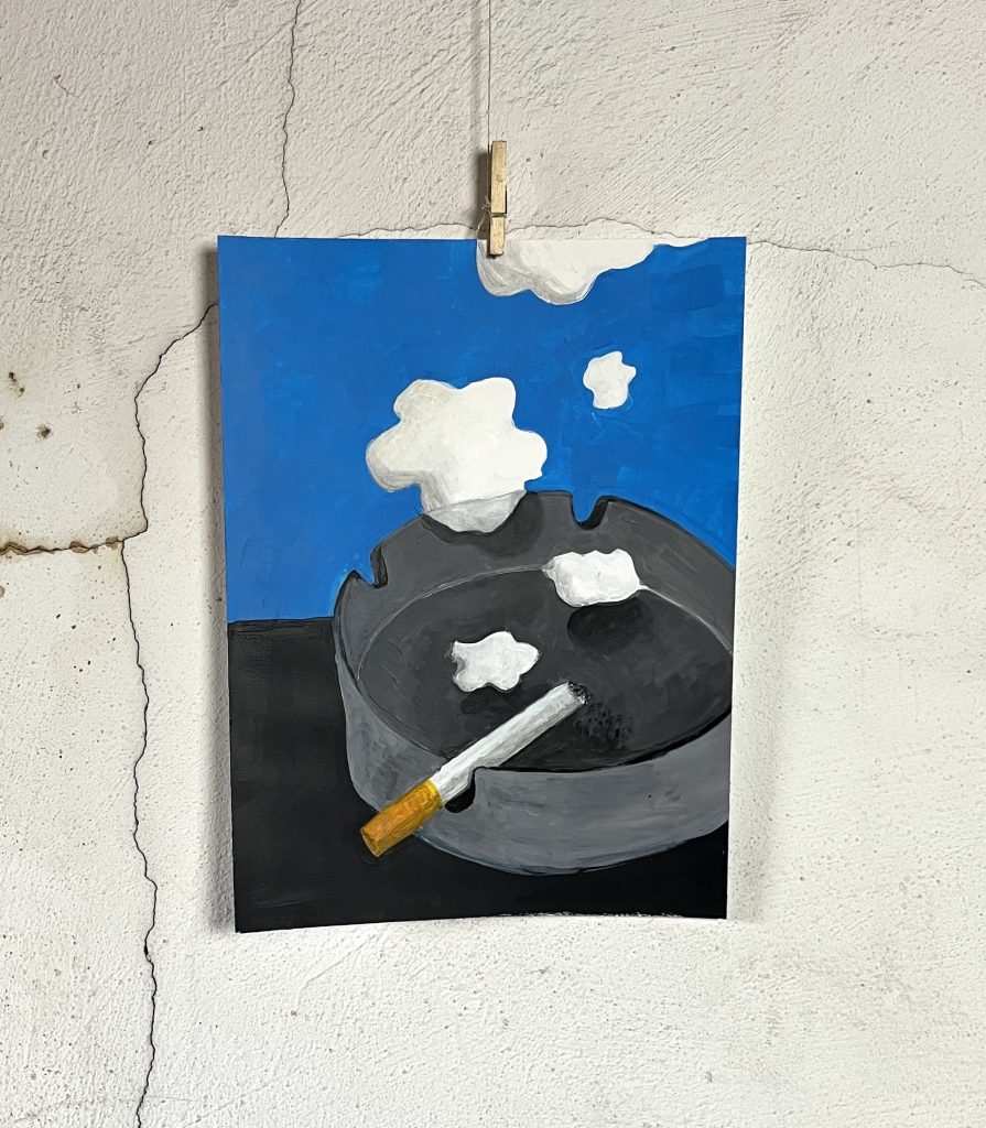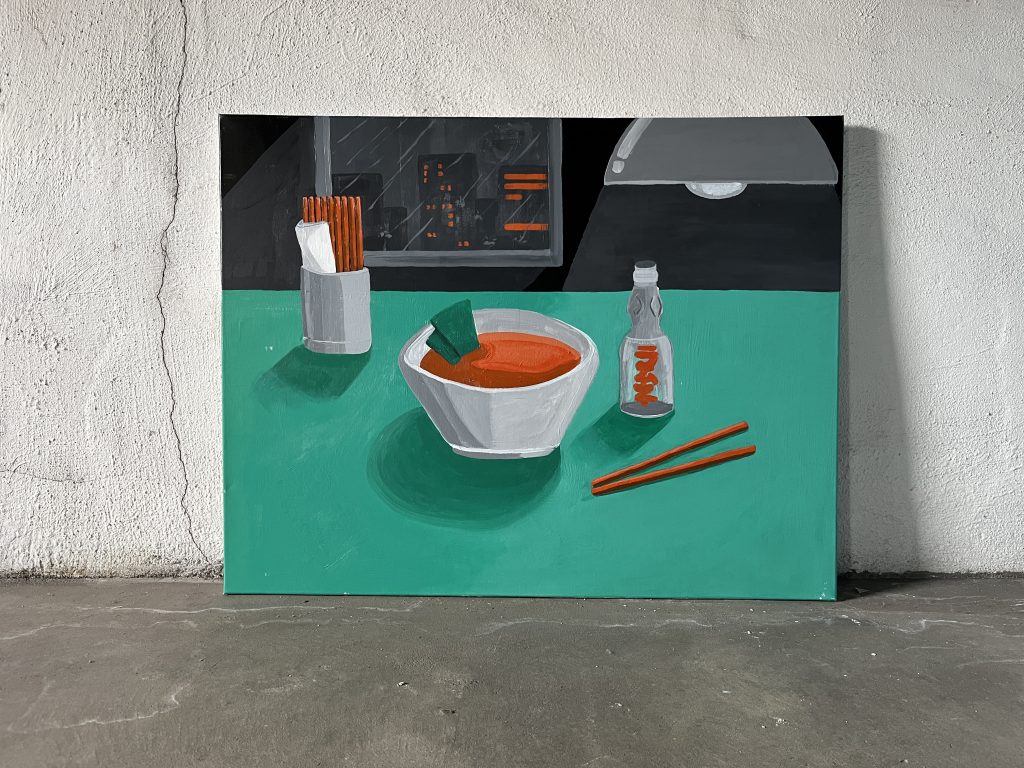 Dinner, 2023 Acrylics on canvas 90 x 70 cmFlower picking, 2024 Acrylics on canvas 100 x 110 cmI recently quit smoking, what you see are clouds, 2024 Acrylics on paper 36 x 48 cmSoup, 2024 Linocut print on paper 24 x 32 cmSome flowers and a chair, 2024 Acrylics on paper 56 x 42 cmHealing, 2022 Acrylics on paper 29,7 x 42 cmPants, 2022 Acrylics on paper 24 x 32 cm